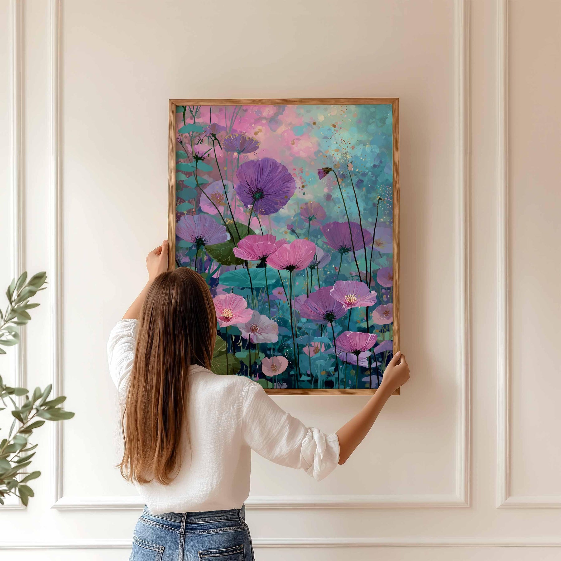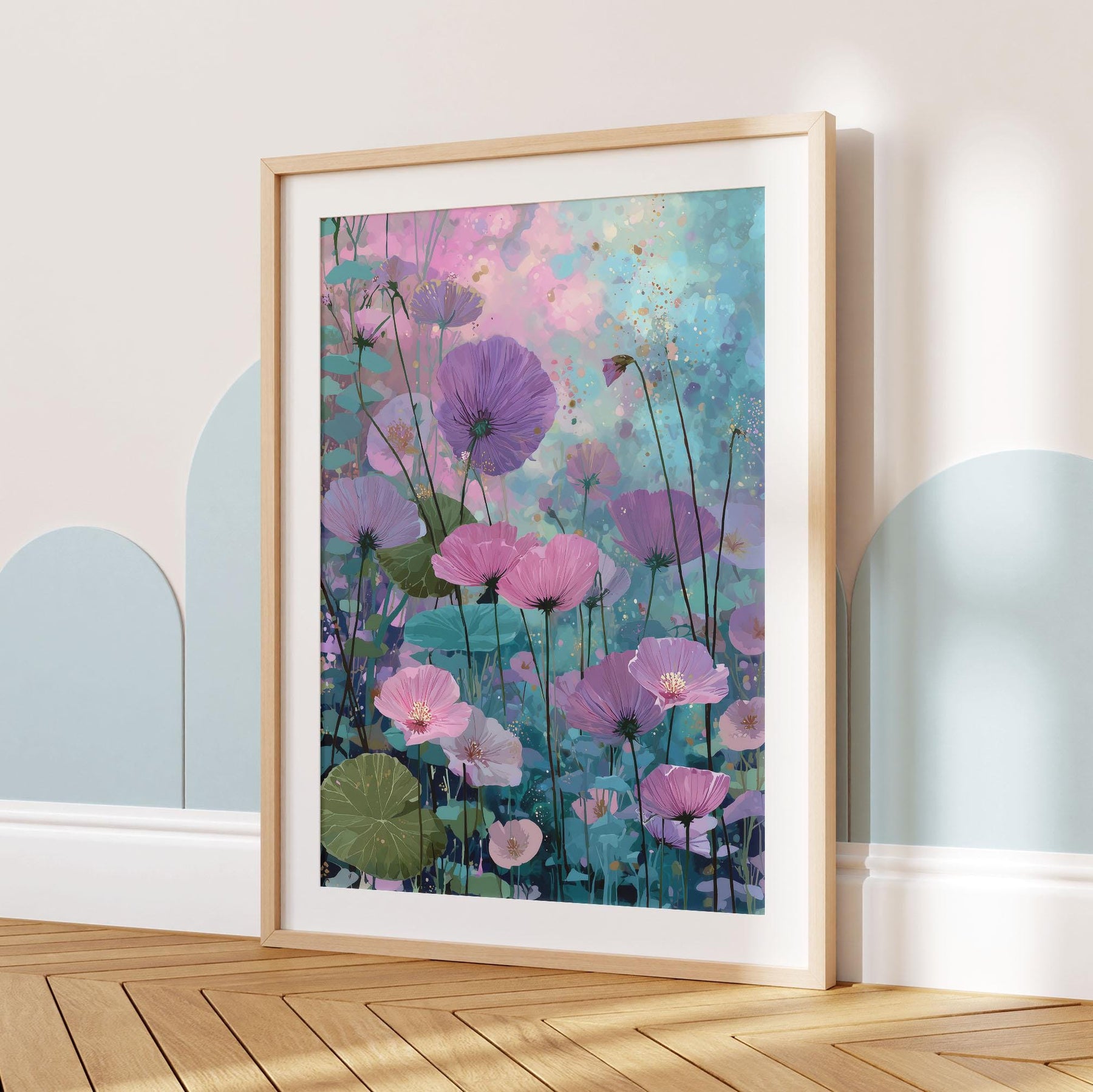 This colourful modern abstract flower print brings a sense of lightness, movement, and calm to any space. Soft purple, pastel pinks and refreshing aqua blues blend beautifully to create a dreamy flower meadow filled with delicate petals, tall flowing stems, and layered foliage.