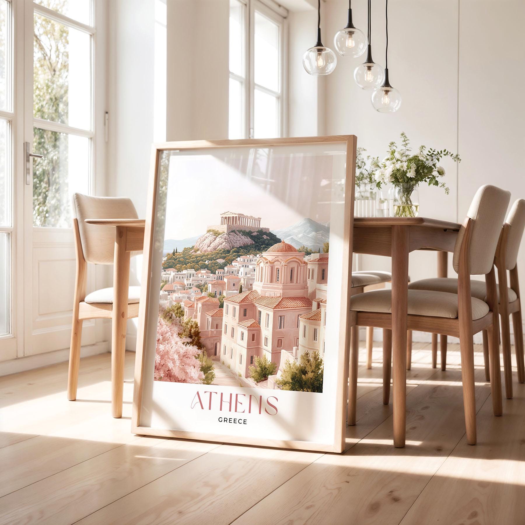 Celebrate the timeless beauty of Athens with this elegant watercolour print in soft pastel beige and pink tones. This artwork captures the serene charm of Greece’s historic capital, blending delicate brushstrokes with a calming colour palette for a sophisticated and stylish look. Perfect for adding a touch of Mediterranean elegance to your home or gifting to a travel lover.