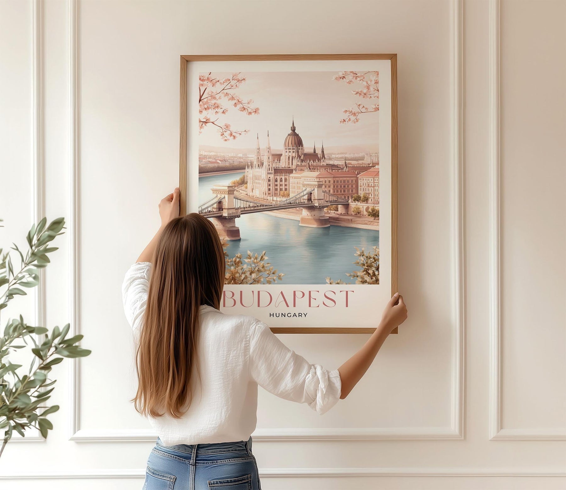 Celebrate the timeless beauty of Budapest with this elegant watercolour print in soft pastel beige and pink tones. This artwork captures the romantic charm of Hungary’s capital, blending delicate brushstrokes with a serene colour palette for a sophisticated, calming aesthetic. Perfect for adding a touch of European elegance to your home or gifting to a travel enthusiast.