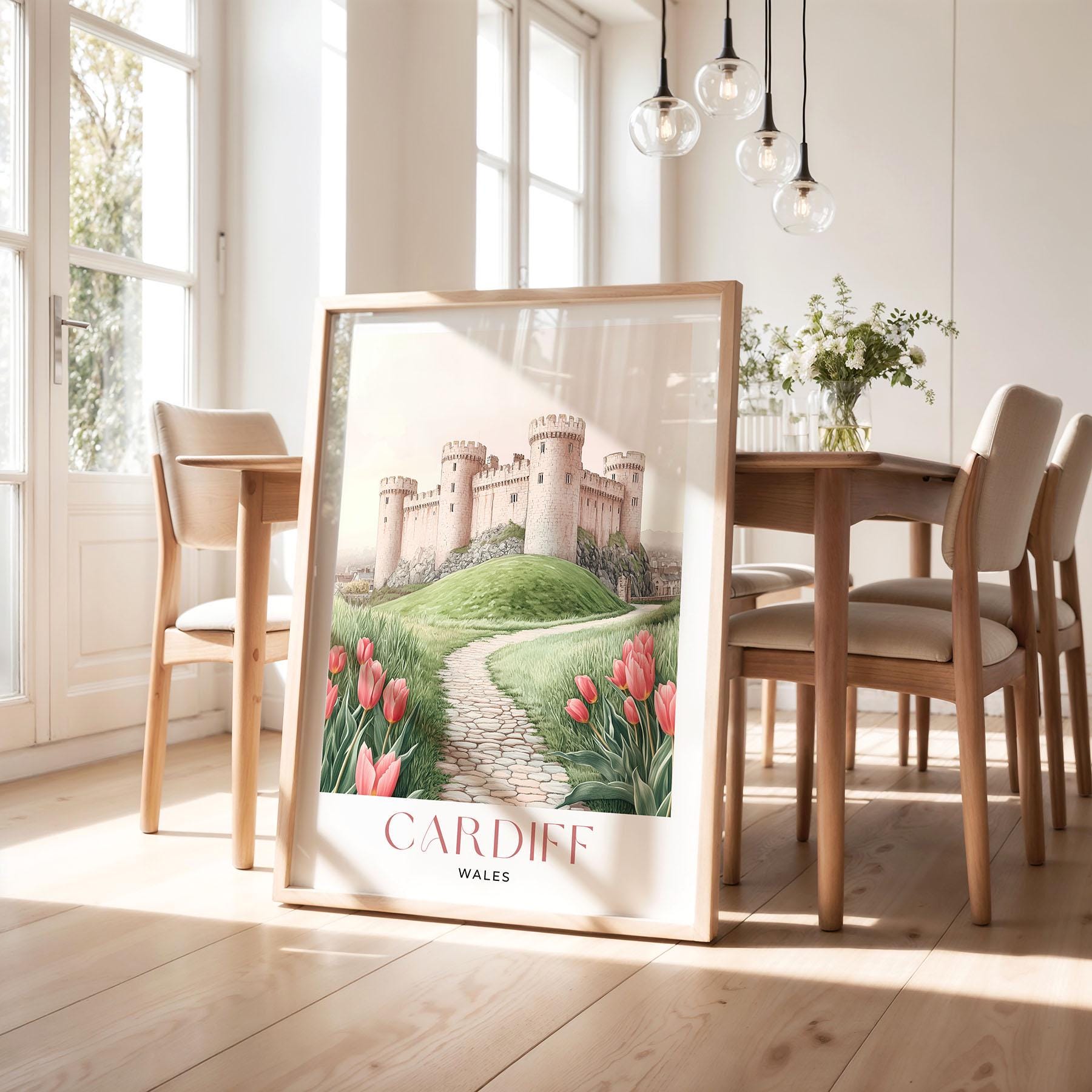 Please Note: This artwork is a stylised representation and does not depict a specific real-life view of Cardiff. It is designed to evoke the spirit and atmosphere of the location through a dreamy, artistic lens.
