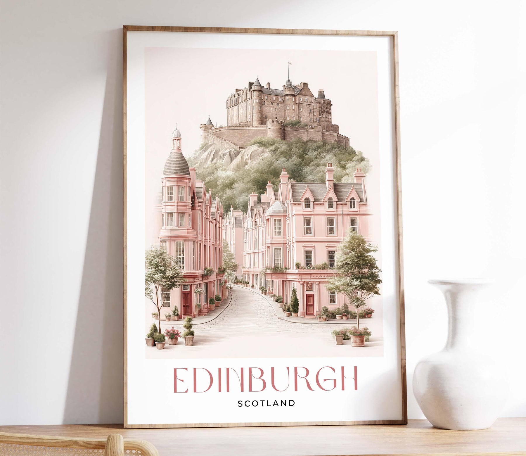 Step into the heart of Edinburgh with this soft and romantic pastel art print, featuring the iconic Edinburgh Castle nestled above a charming high street scene. Rendered in delicate watercolour tones of blush pink and sage green, this print evokes the quiet elegance of Scotland’s capital city.