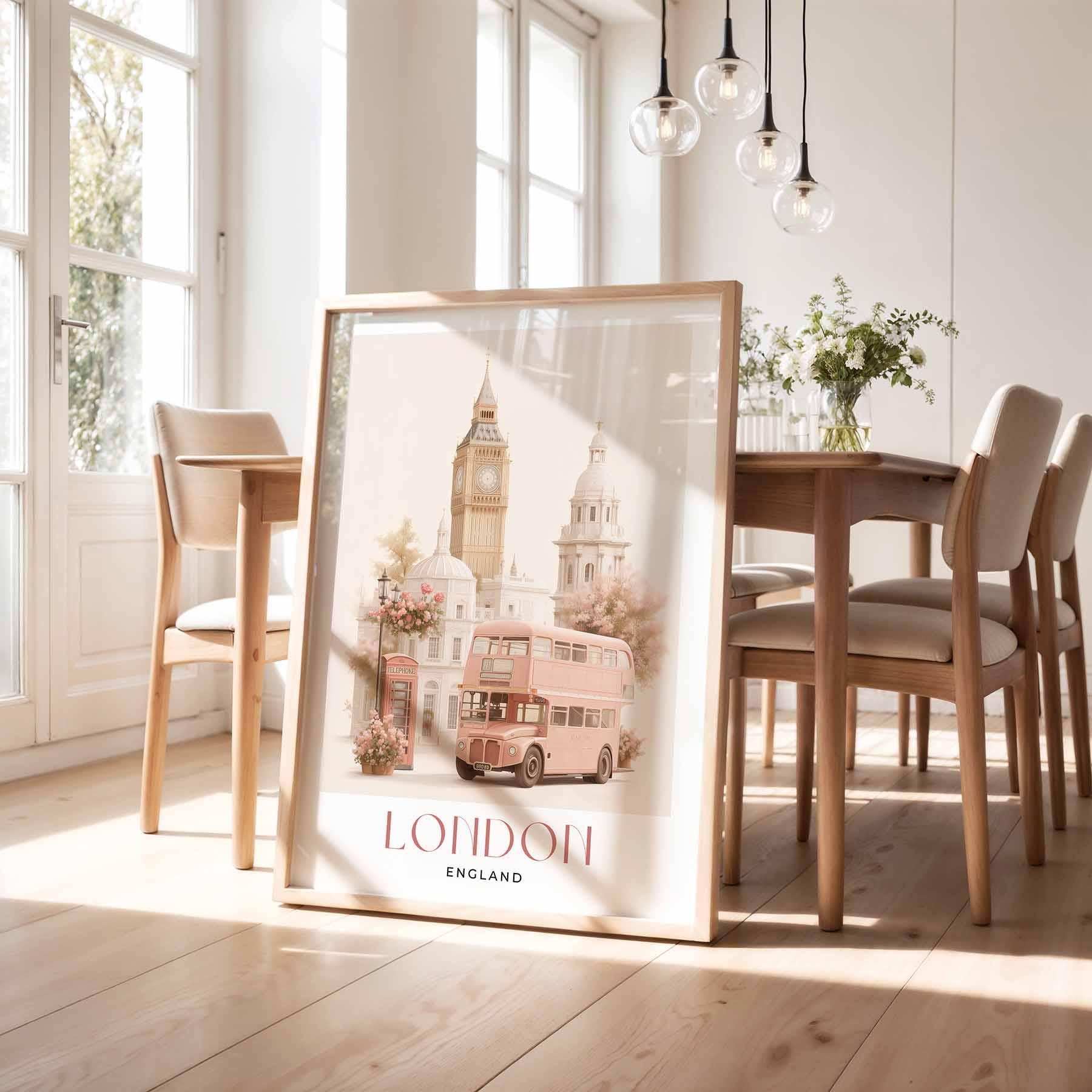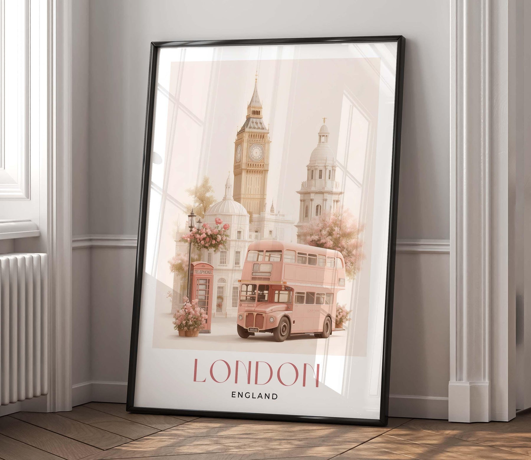 Capture the timeless charm of London with this beautifully illustrated travel art print featuring Big Ben, classic London architecture, and the iconic double-decker bus. Painted in soft pink and beige tones, this elegant vintage watercolour style evokes a sense of nostalgia and sophistication, perfect for adding a touch of British flair to any space.