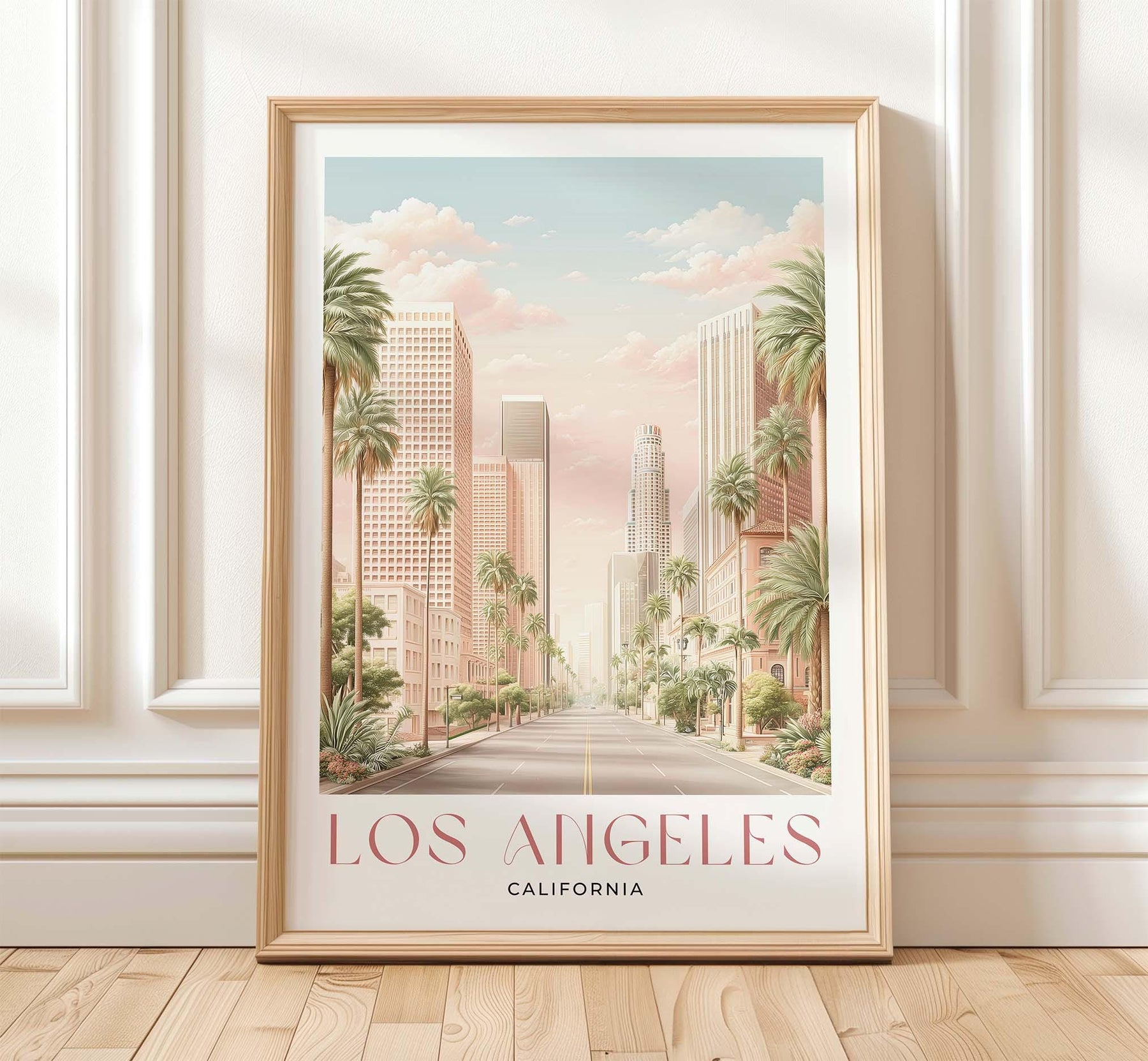 Wander into a tranquil Los Angeles dreamscape with this romantic travel art print, rendered in soft blush pinks and pale blue hues. The wide boulevard stretches into the distance, flanked by towering skyscrapers and swaying palm trees — a serene moment of stillness in the heart of the city.