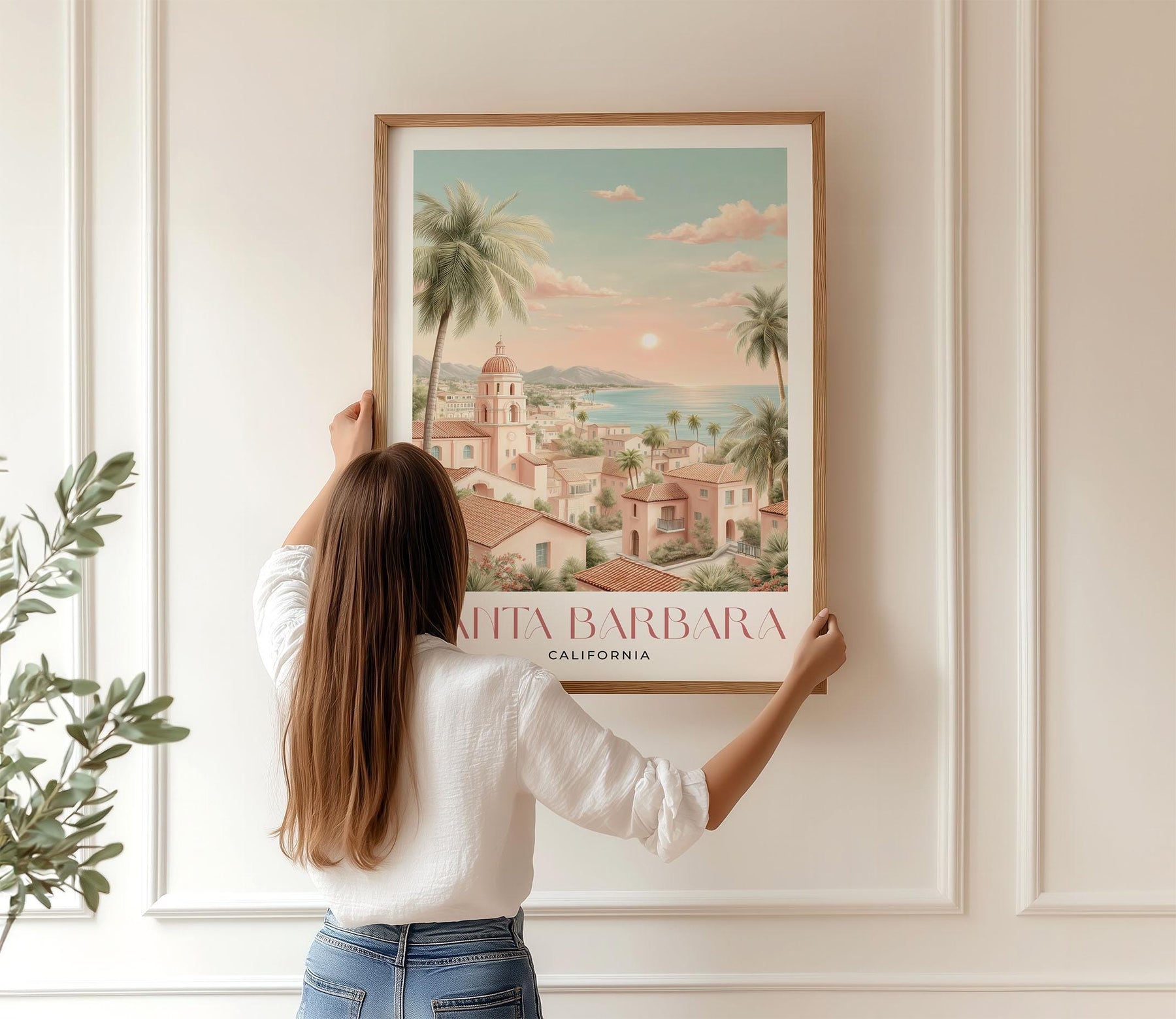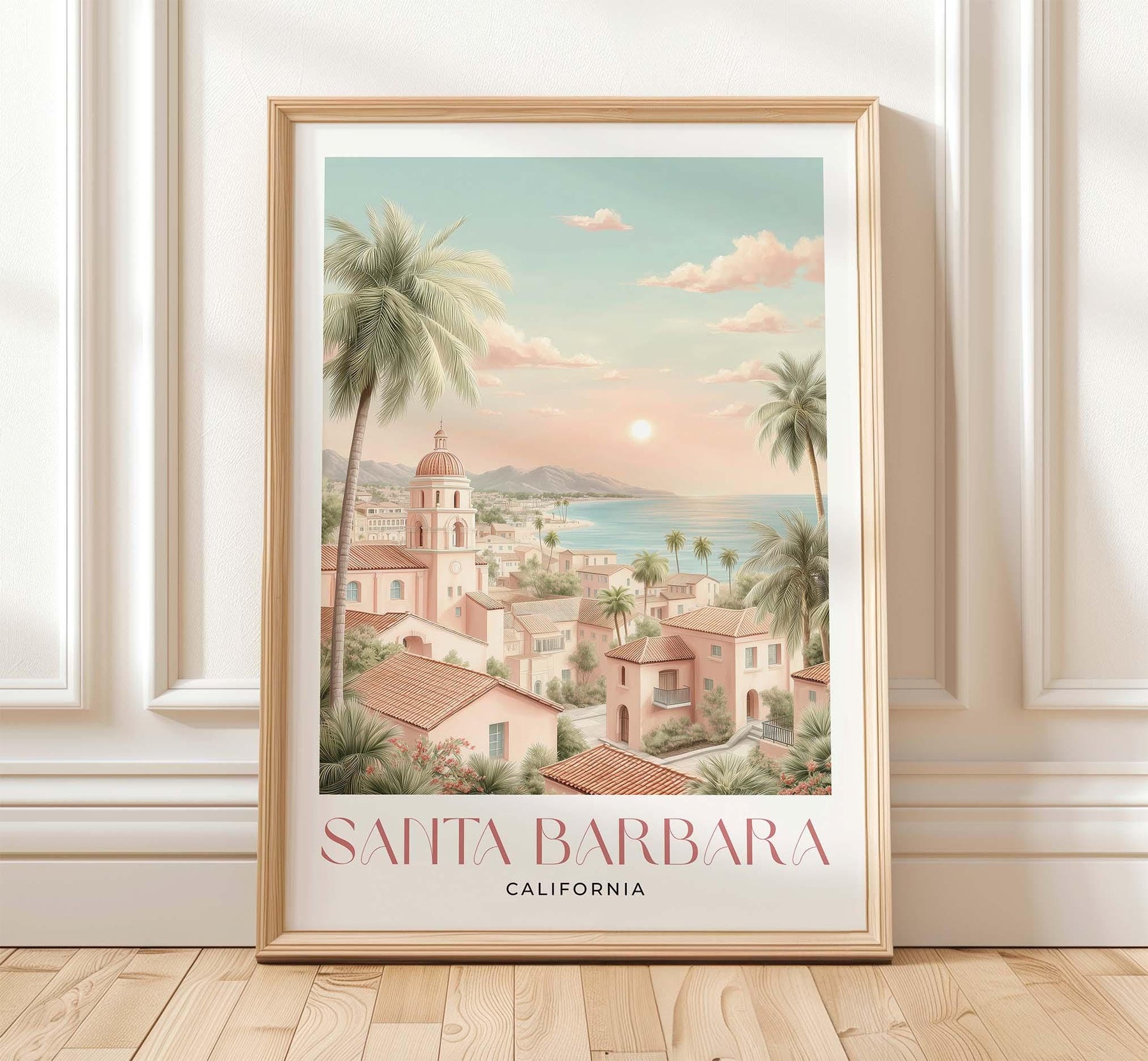 Please Note: This artwork is a stylised representation and does not depict a specific real-life view of Santa Barbara. It is designed to evoke the spirit and atmosphere of the location through a dreamy, artistic lens.