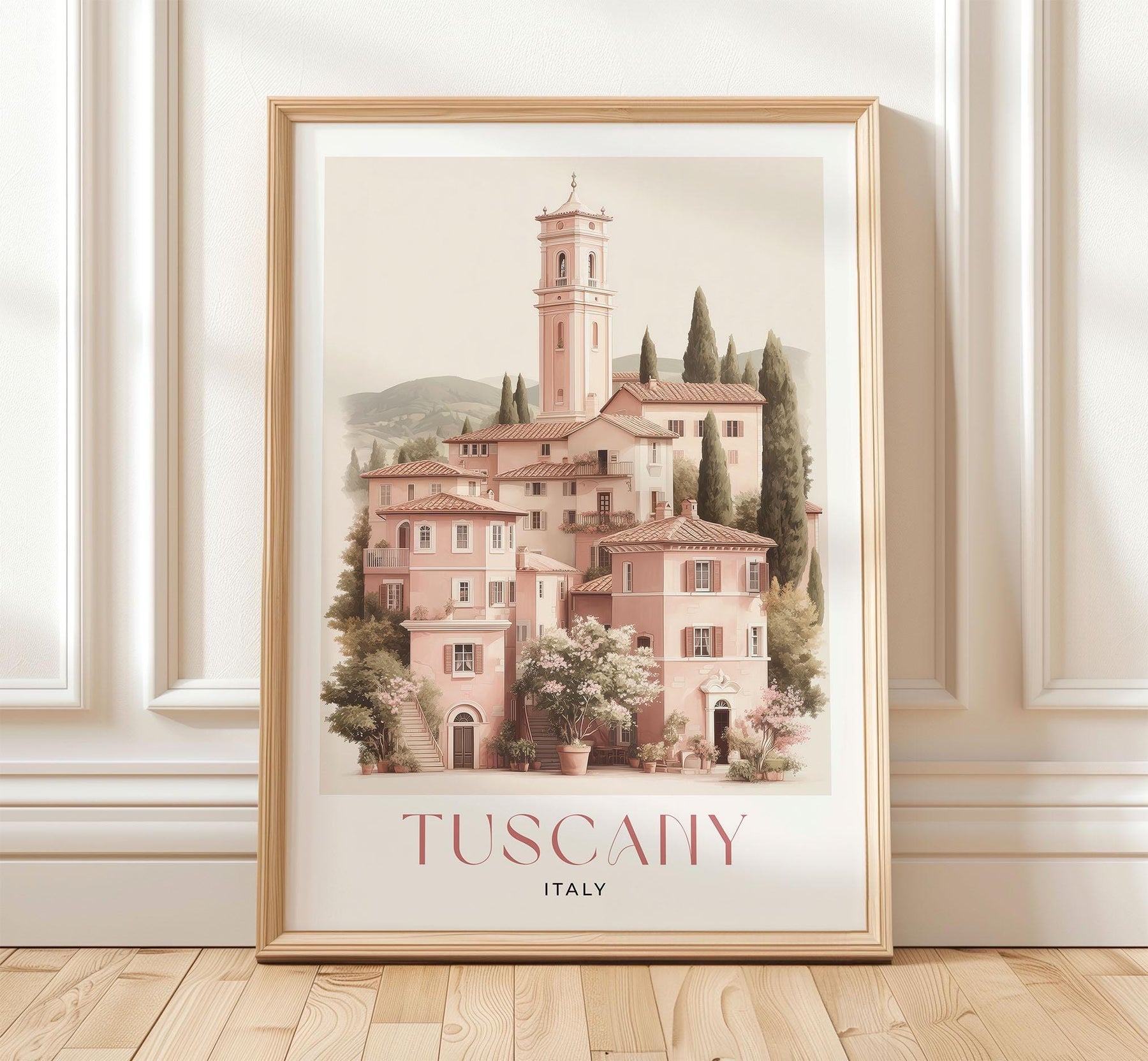 Illustrated in vintage blush pinks and warm beige tones, this watercolour-style scene features traditional Tuscan buildings nestled among rolling green hills. Tall cypress trees rise between terracotta rooftops, while oversized plant pots and flower-lined stone steps add a touch of rustic charm and Mediterranean elegance. The gentle palette and serene composition evoke a sense of timeless beauty and relaxed sophistication.