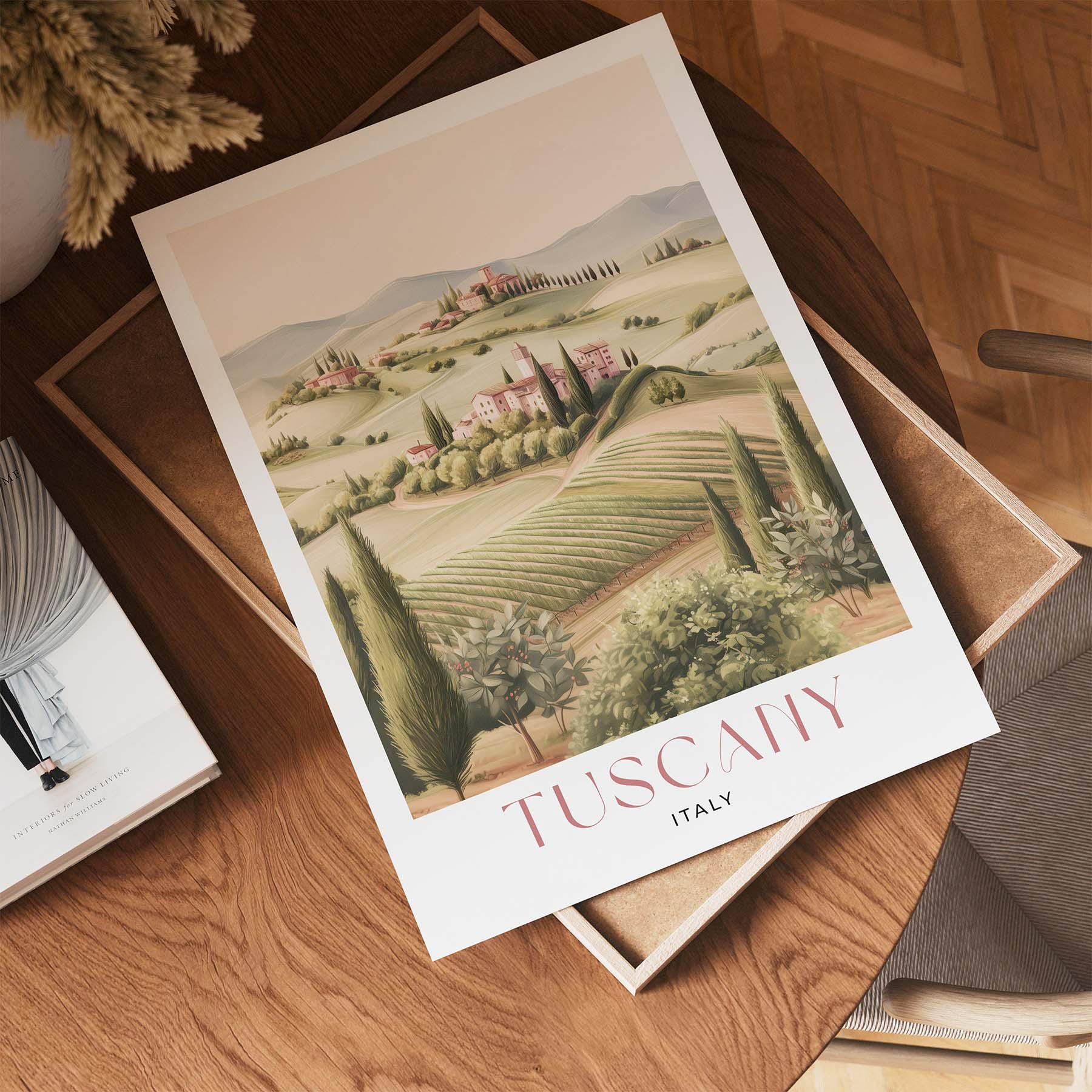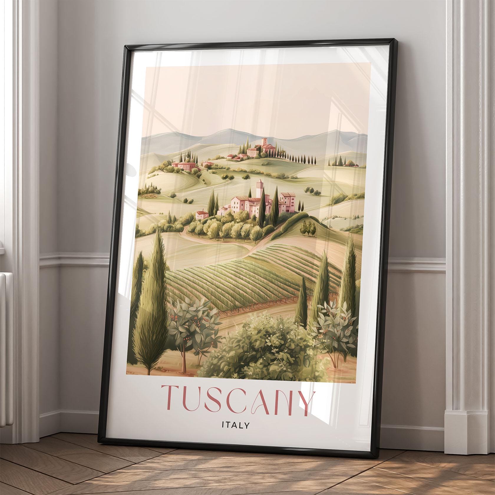 Please Note: This artwork is a stylised representation and does not depict a specific real-life view of Tuscany. It’s designed to evoke the spirit and atmosphere of the location through a dreamy, artistic lens.