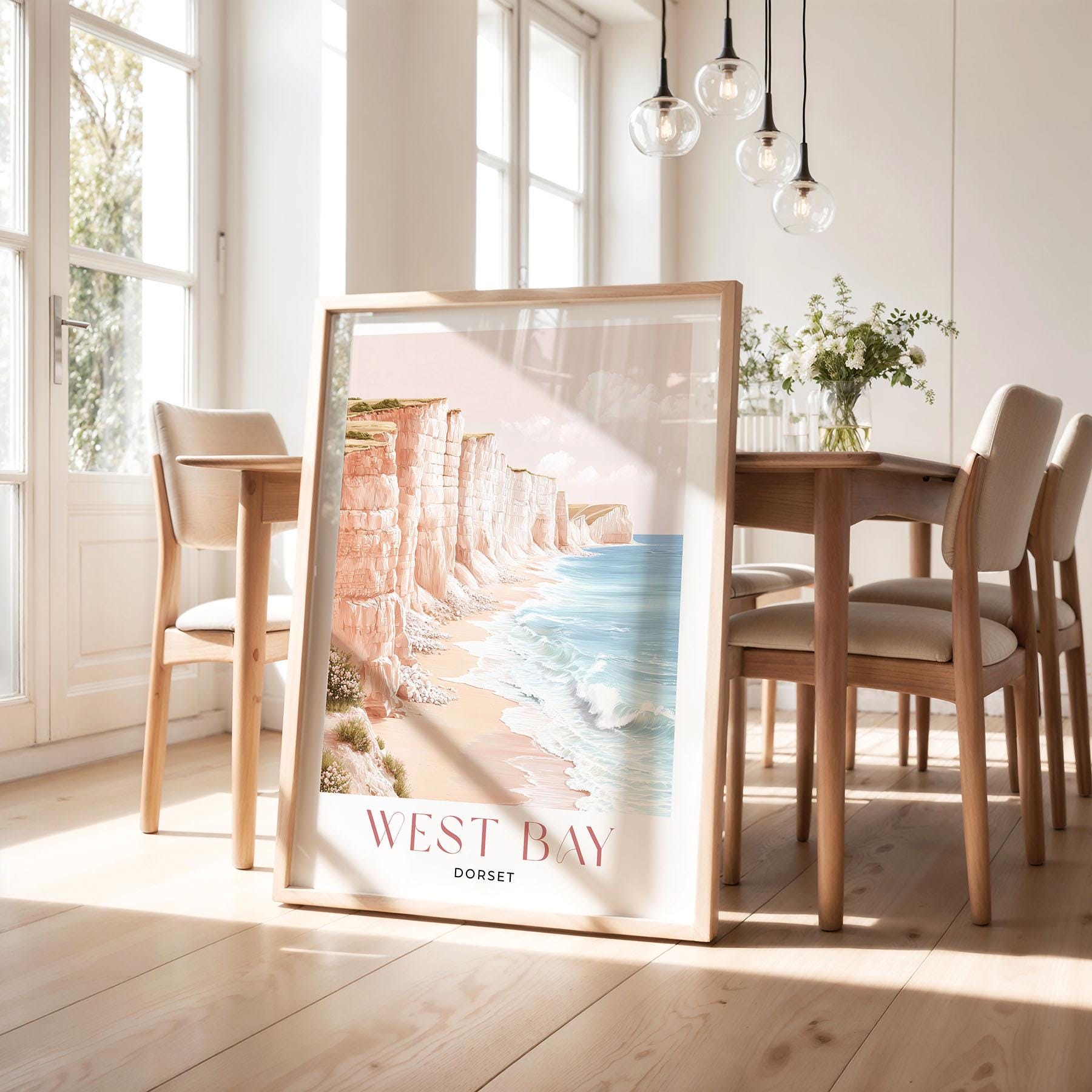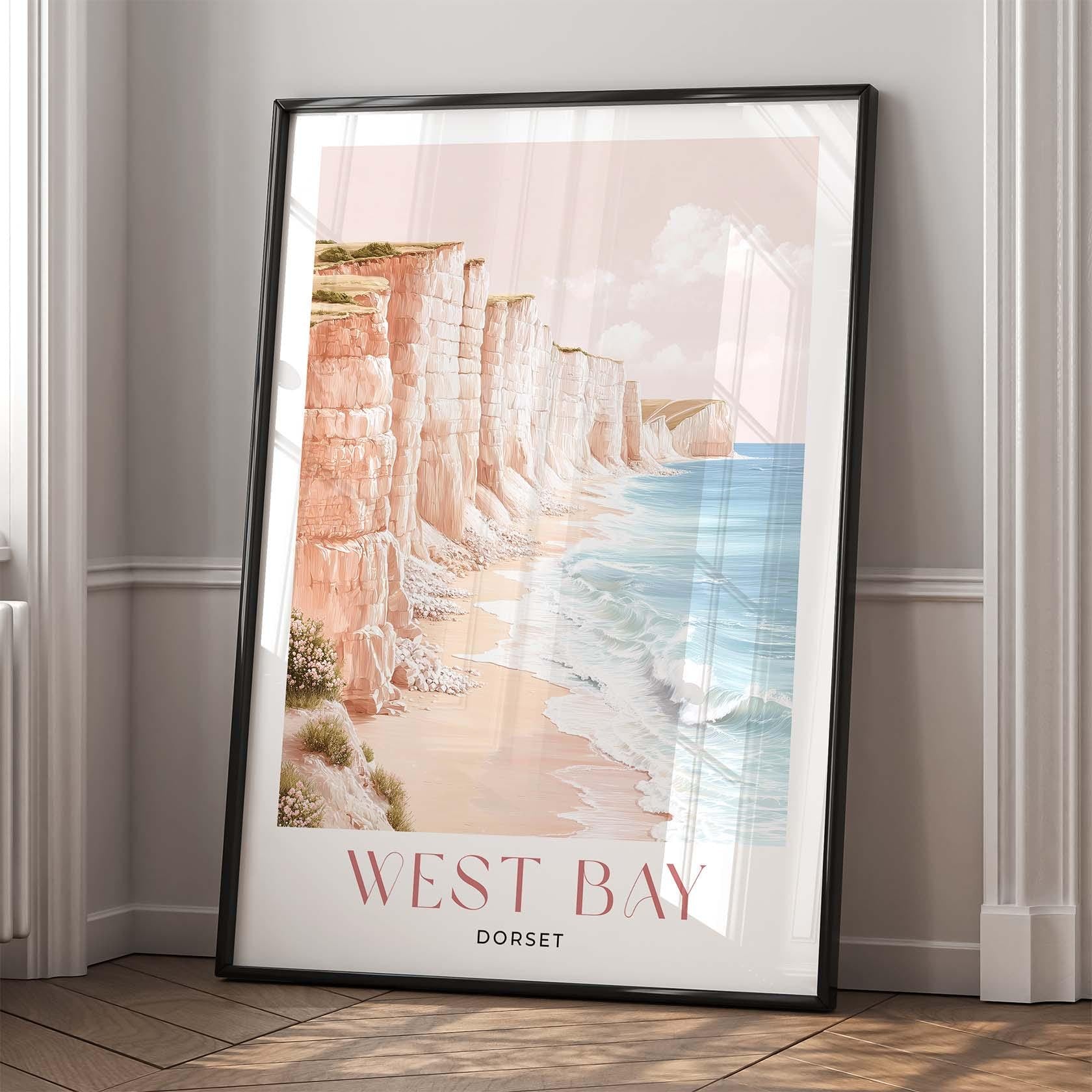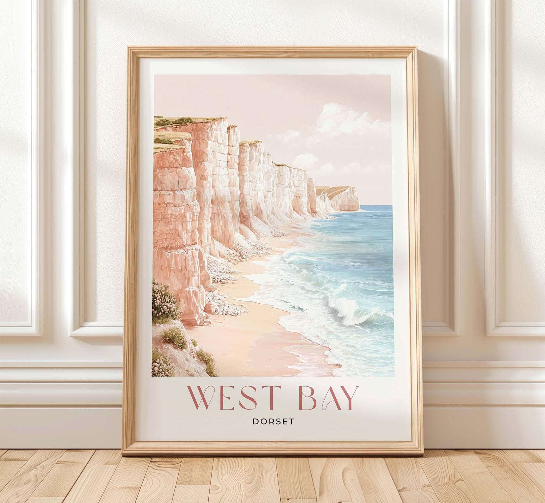 Let your walls breathe in the sea air with this dreamy blush-toned art print of West Bay, Dorset. Capturing the iconic golden cliffs as they rise above a tranquil shoreline, this piece evokes the quiet majesty of England’s Jurassic Coast. The muted blue sea laps gently against the beach, while soft blush skies cast a romantic glow over the landscape.