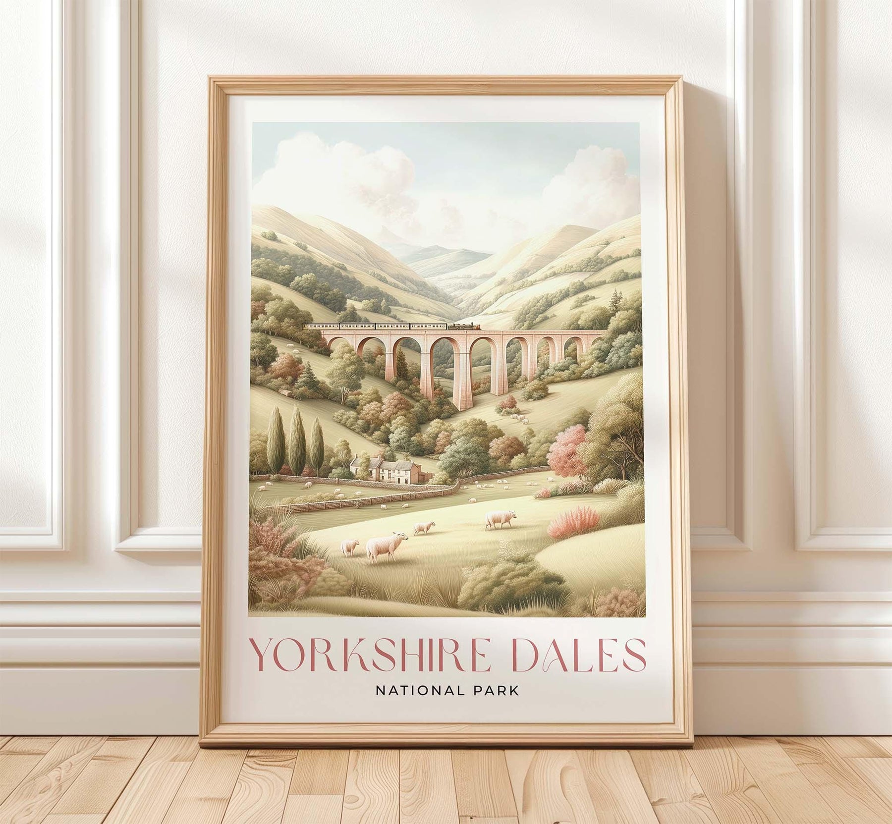 Wander into the heart of the Yorkshire Dales, where rolling hills stretch beneath a hazy sky and a quiet train glides across the majestic Ribblehead Viaduct. This soft watercolour print evokes the peaceful rhythm of rural England—lush green pastures dotted with sheep, winding stone walls, and a lone farmhouse nestled below. Rendered in gentle pinks, blues, and earthy greens, it’s a nostalgic tribute to the countryside’s quiet beauty and timeless charm. Perfect for lovers of pastoral landscapes, travel memories, and romantic home decor.