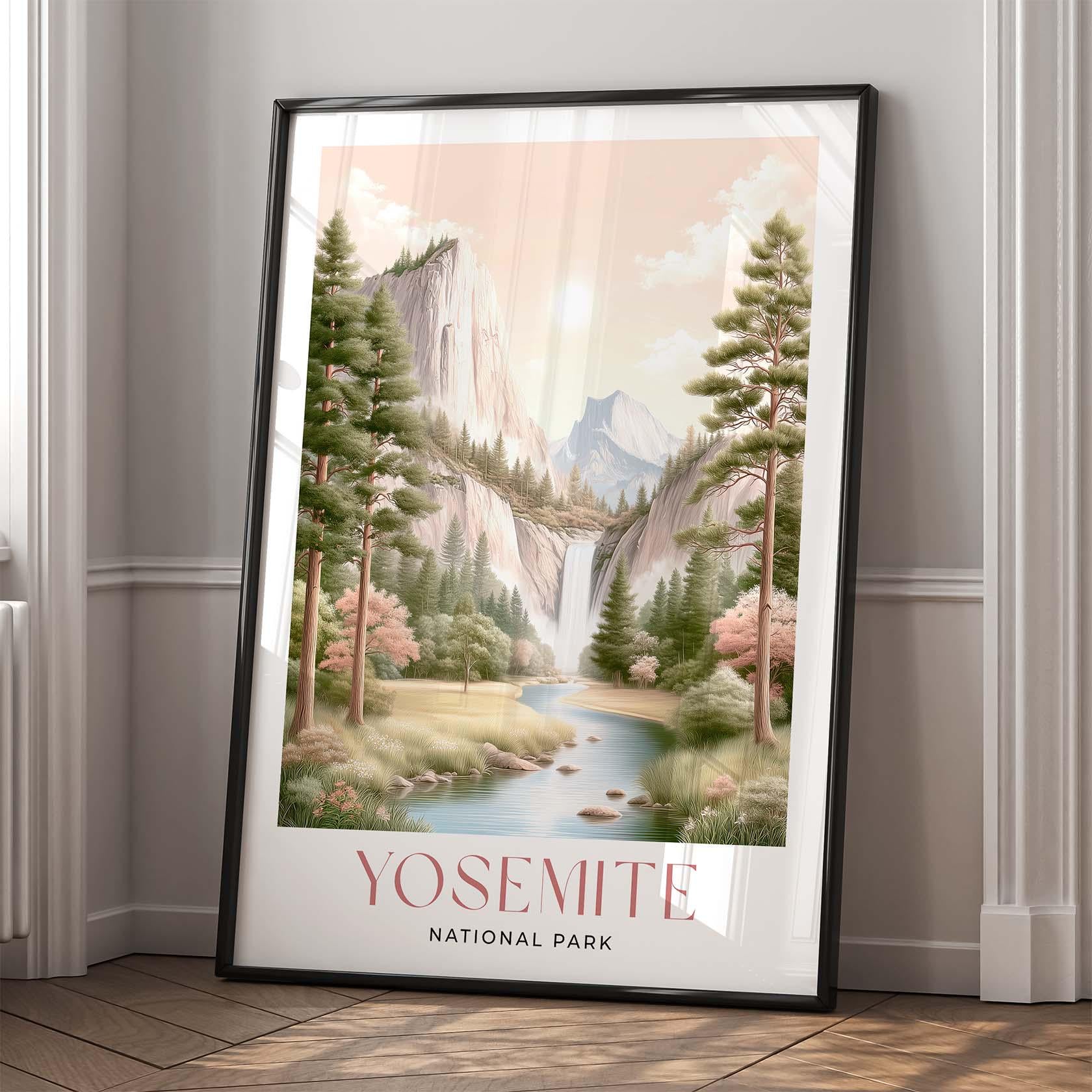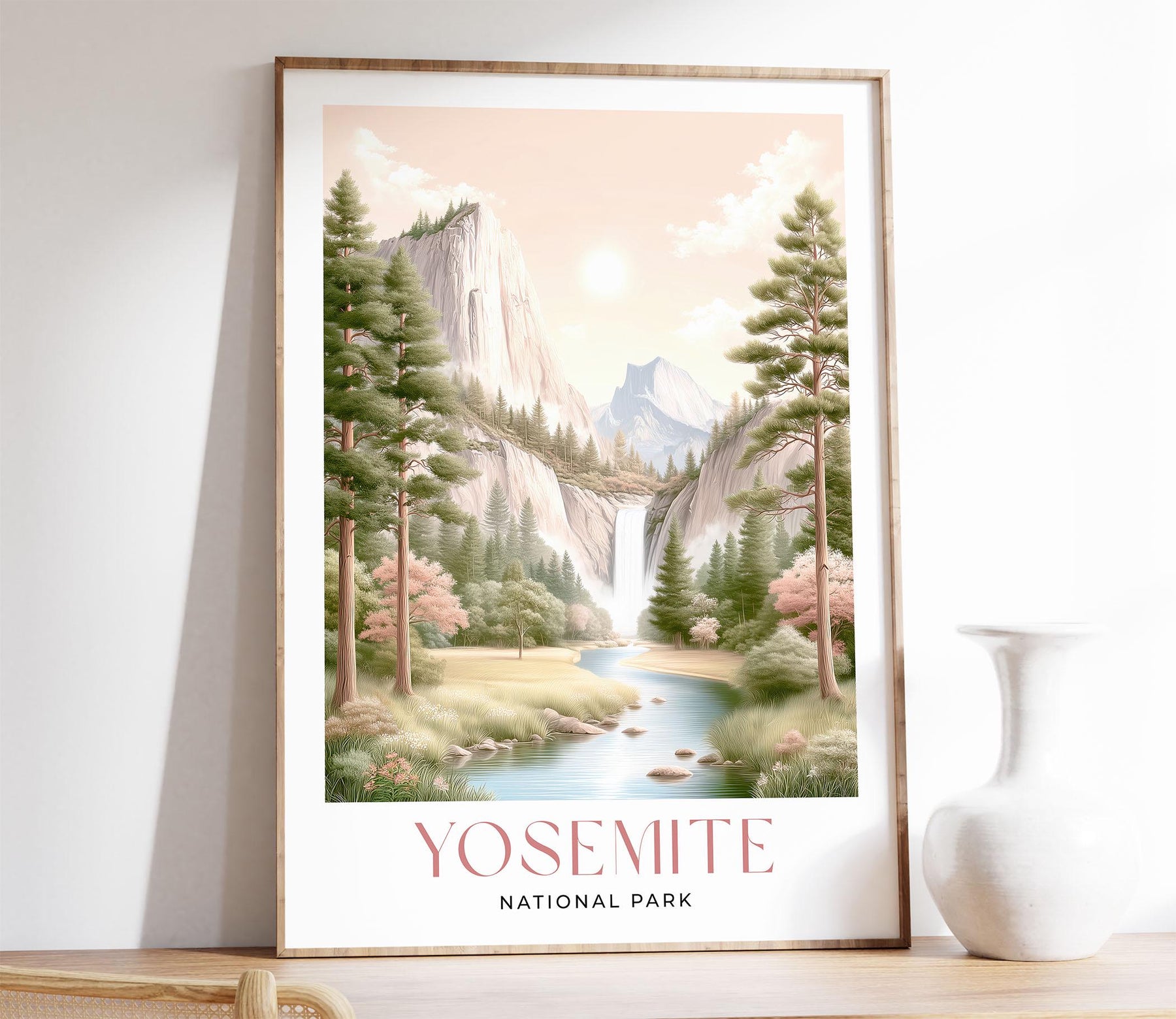 Bring the majesty of Yosemite into your home with this pastel watercolour art print, capturing the iconic cliffs and cascading waterfall of California’s beloved national park. Soft beige and blush tones blend with gentle greens, portraying the tranquil beauty of Yosemite Falls as it flows into a serene pool below.