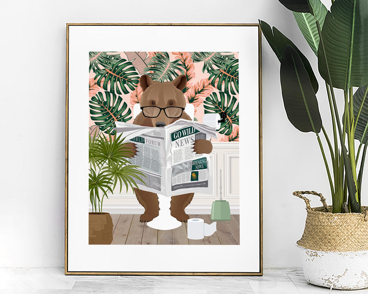 Introducing our funny brown bear sitting on the toilet wearing glasses and reading a newspaper in a colourful botanical bathroom. It's the perfect fun animal art print to complement your eclectic maximalist decor in the bathroom, or any other room in the home or office.