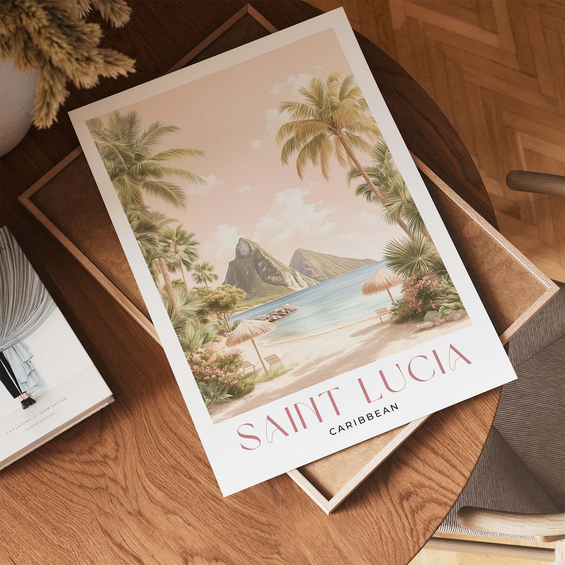 Please Note: This artwork is a stylised representation and does not depict a specific real-life view of Saint Lucia. It is designed to evoke the spirit and atmosphere of the location through a dreamy, artistic lens.